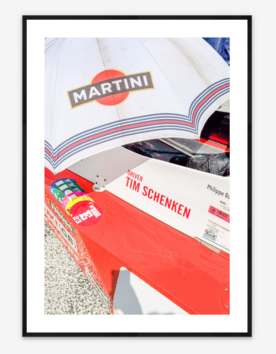 "Aperol Spritz," this vibrant photo captures the iconic Trojan T103 Formula 1 car, driven by Tim Schenken during the 1974 season. The image, taken at the 2024 Zandvoort Historic Grand Prix, highlights the car's distinctive red livery under the shade of a Martini-branded umbrella, a nod to the classic racing liveries of the era. The scene evokes a nostalgic atmosphere, blending the glamour of vintage motorsport with the casual elegance of a summer cocktail. The Trojan T103, with its unique design and historic significance, stands as a testament to the thrilling and colorful world of 1970s Formula 1.