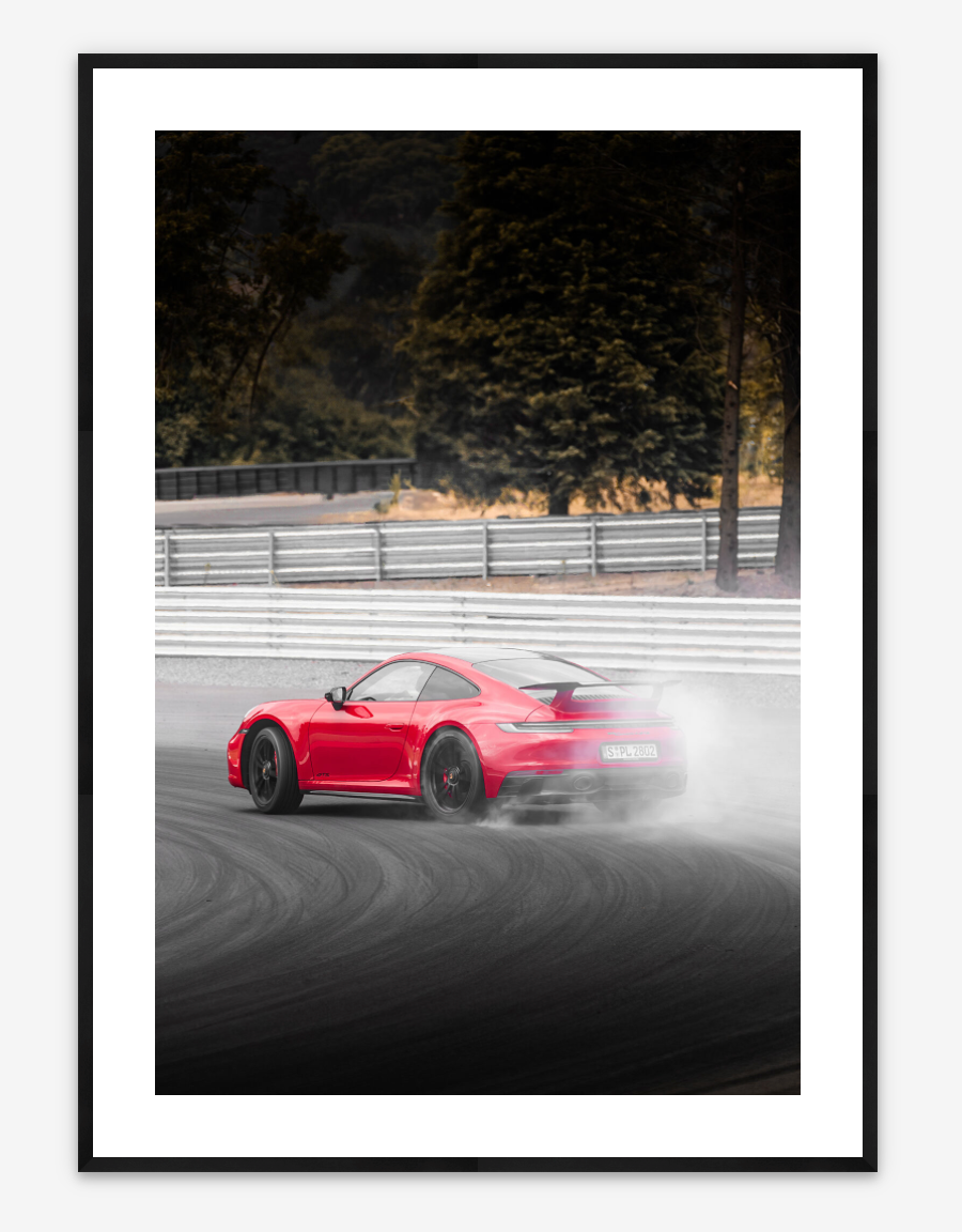 "Flying is for Rookies," this striking photograph captures a Porsche 911 Turbo S in a dynamic drift at the Mexico Drive Resort, a circuit designed by Hermann Tilke. The image showcases the car's impressive agility and power, as it skillfully navigates a curve, leaving a trail of smoke in its wake. The vibrant red of the 911 contrasts with the dark tarmac and the muted tones of the surrounding trees, emphasizing the car's commanding presence on the track. This scene encapsulates the thrill of high-performance driving, celebrating the mastery required to control such a powerful machine with finesse and precision. The title playfully nods to the boldness of drifting, elevating the art of ground-bound maneuvers.