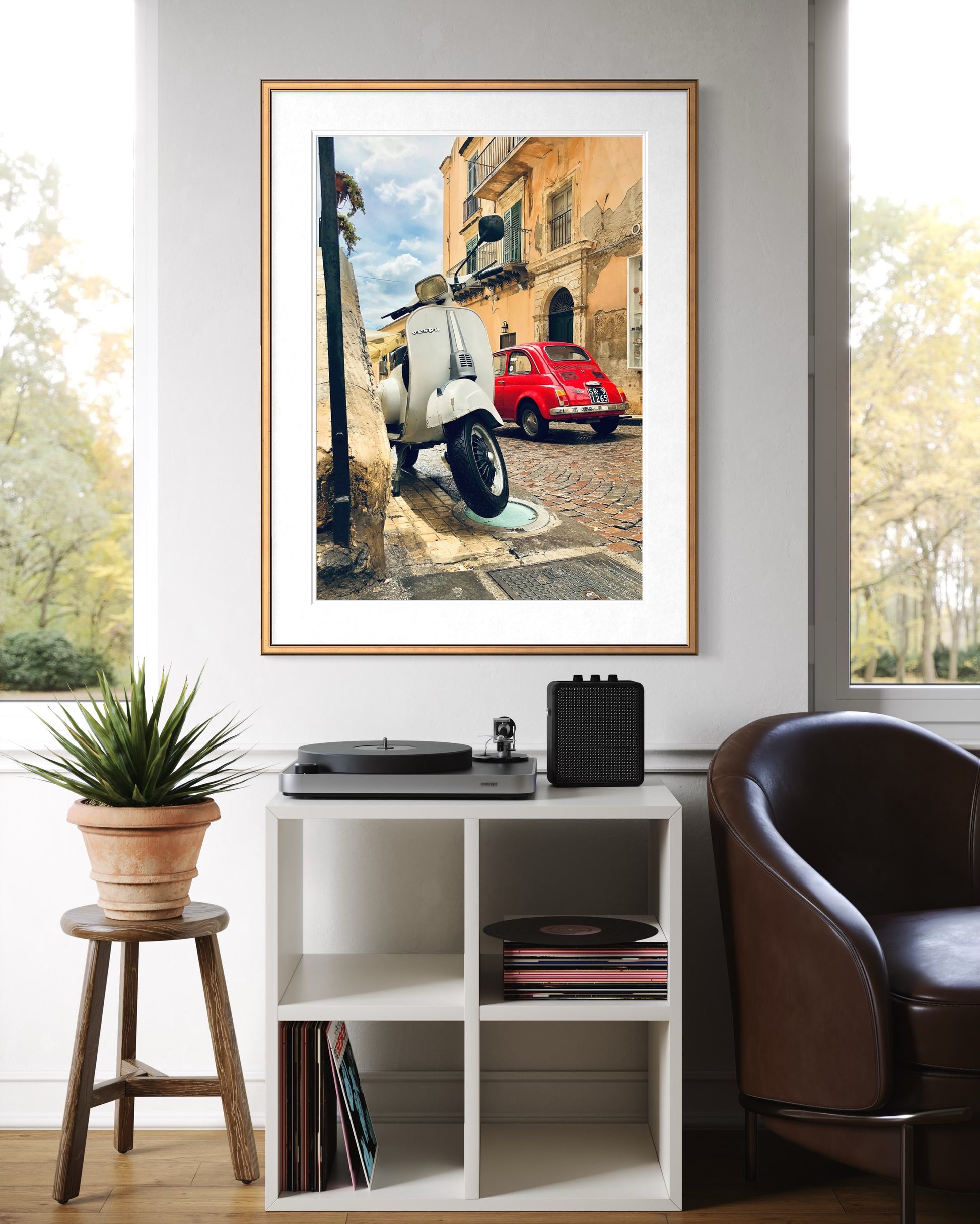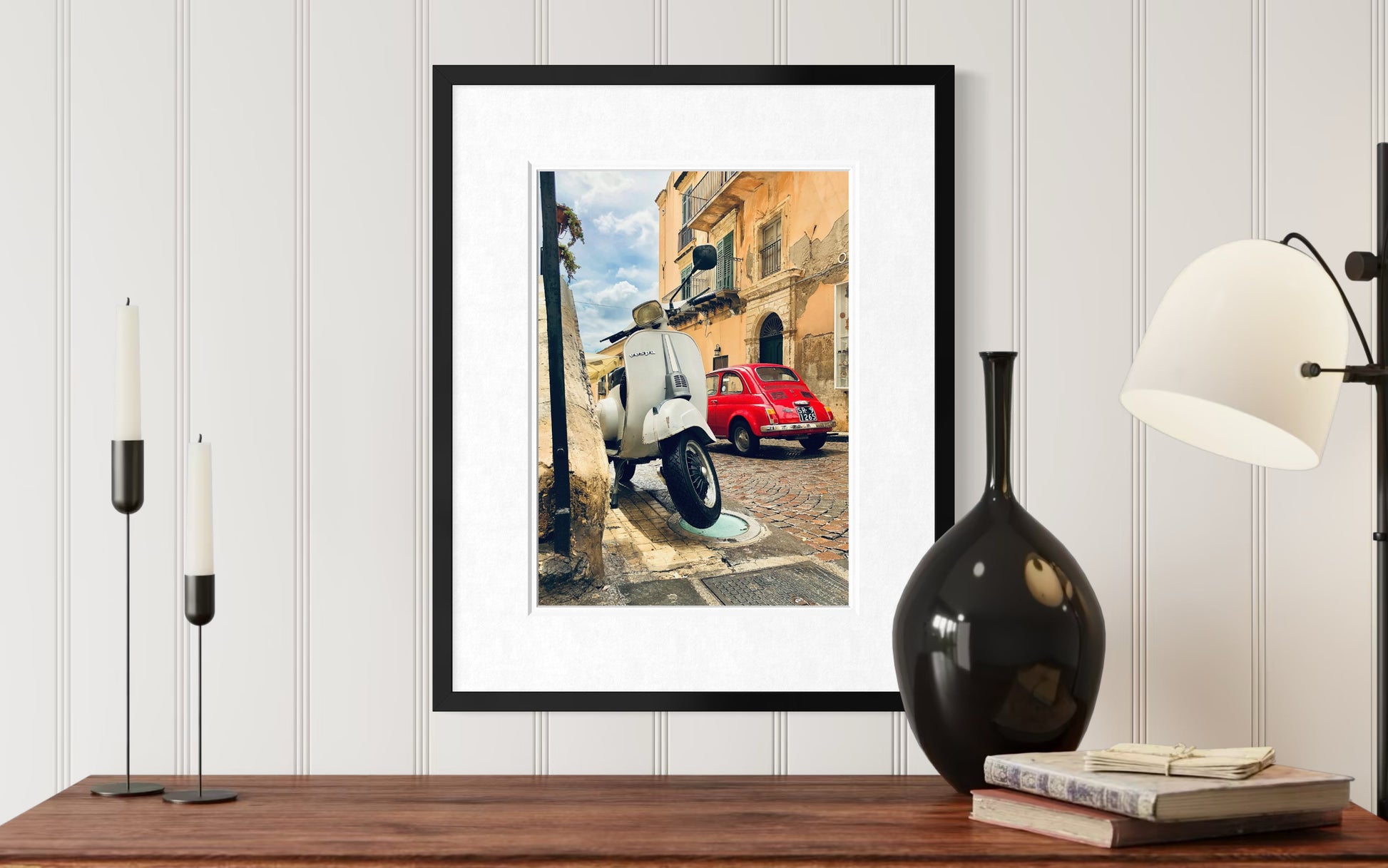 Captured in Noto, Italy in 2018, this image distills the spirit of La Dolce Vita. A classic Vespa and a Fiat 500 - two enduring symbols of Italian design - sit quietly within the warm tones of southern Sicily, evoking a slower pace and a timeless sense of style rooted in everyday life.