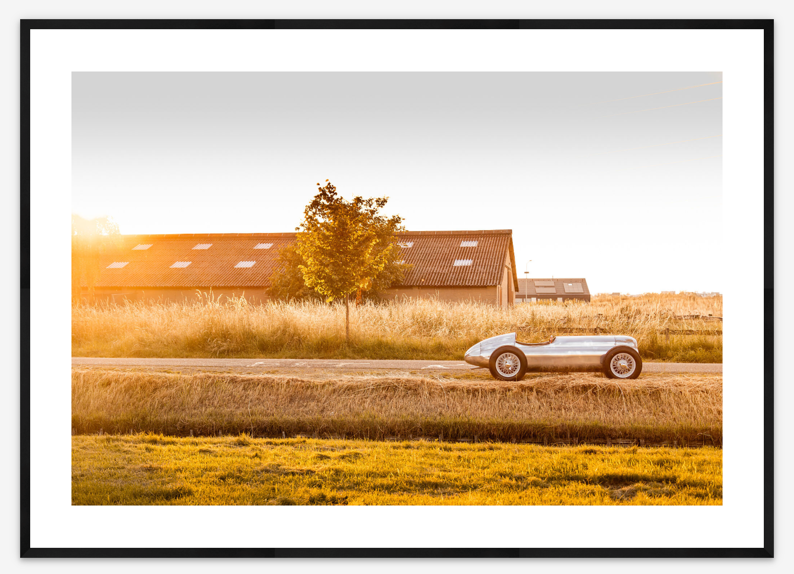 "Monoposto," this image features the Monoposto P189, a sleek, handcrafted car designed and built by Dutch designer and engineer Tom Meeuwsen in Den Bosch, Netherlands. The car's minimalist, polished aluminum body recalls the elegant simplicity of early Talbot Lago racing cars, though it stands as an original creation without direct inspiration from any specific model. The interior is distinguished by the inclusion of original Jaeger LeCoultre gauges from a Bugatti Type 57 Atlantic, adding a touch of historic luxury. The photograph captures the car in a picturesque rural setting, bathed in the warm glow of a setting sun, highlighting its smooth lines and timeless beauty.