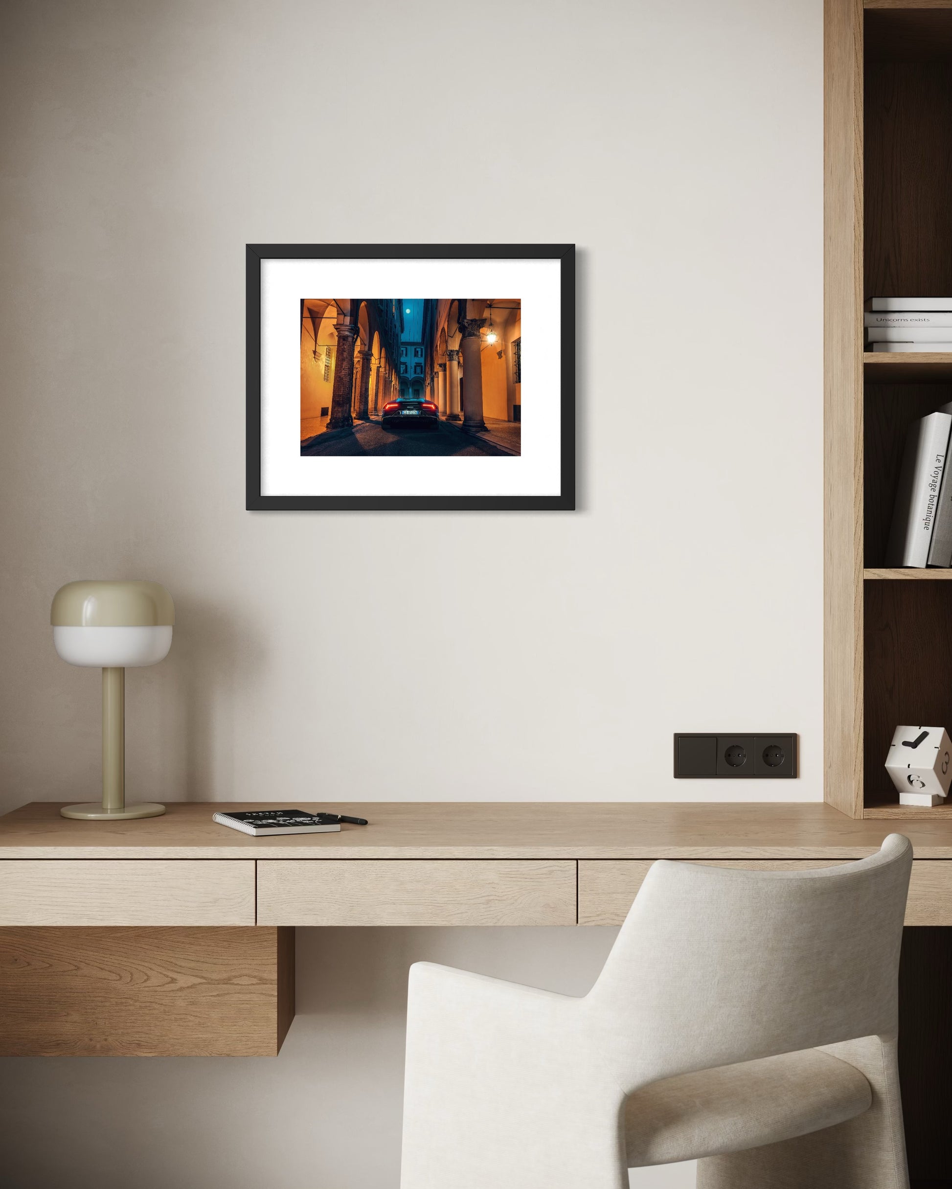 A Lamborghini Huracán EVO rests beneath the soft glow of moonlight, framed by Bologna’s iconic porticoes. Captured by the Rooy Twins, the scene balances architectural rhythm with automotive presence, celebrating Italian design through light, shadow, and restraint.