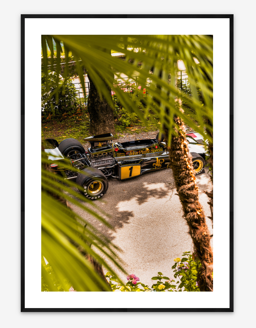 "Negroni," this evocative photograph features the legendary Lotus 72D, the car in which Emerson Fittipaldi won the 1972 Formula 1 World Championship. Captured at FuoriConcorso 2024 at Lake Como, the image pairs the classic racing machine with the soft leaves of a palm tree in the foreground. The lush greenery hints at the timeless allure of the Italian landscape, while the car, an icon of motorsport history, stands as a testament to engineering excellence and racing heritage. The title "Negroni" draws a parallel to the classic cocktail, blending tradition with a sense of refined sophistication.