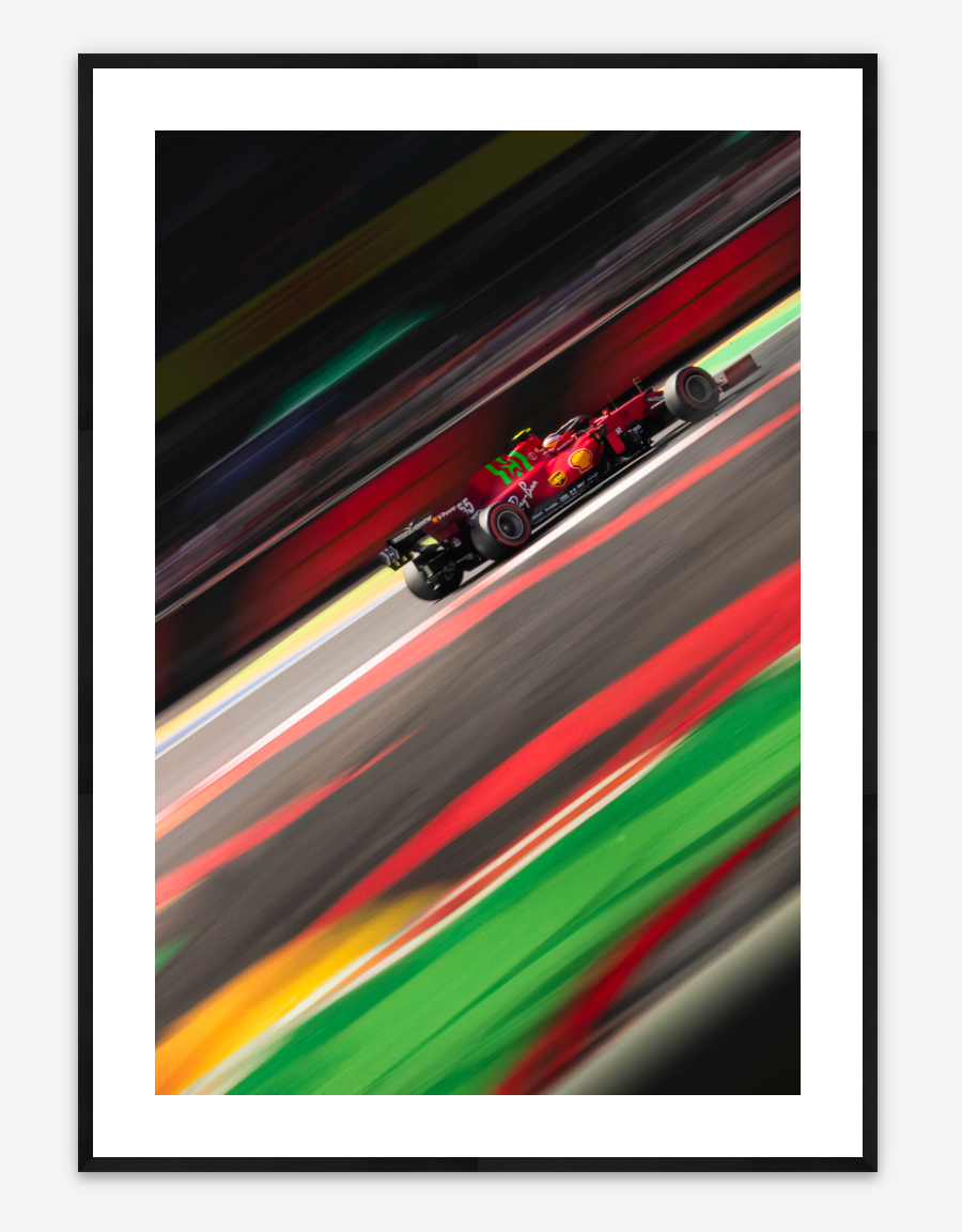 "Perceval," this dynamic photograph captures Charles Leclerc driving his Ferrari SF21 during the 2021 Mexican Grand Prix. The image conveys a sense of speed and motion as the red Ferrari car blurs against the vibrant colors of the track and surroundings. The nickname "Perceval," derived from Leclerc's last name, highlights his valor and skill on the circuit, akin to the noble knight from Arthurian legend. The scene is filled with energy and excitement, encapsulating the thrill of Formula 1 racing and the vibrant atmosphere of the Mexico City event.