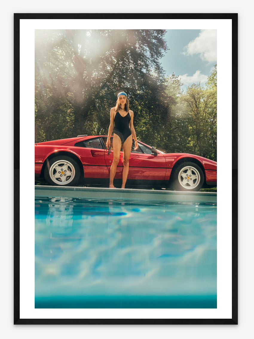 A sunny summer day frames the Ferrari 328 GTB in a scene of leisurely elegance by the pool. The Rooy Twins’ photography highlights the vibrant red paint against the tranquil blue waters, celebrating a quintessential Mediterranean lifestyle.