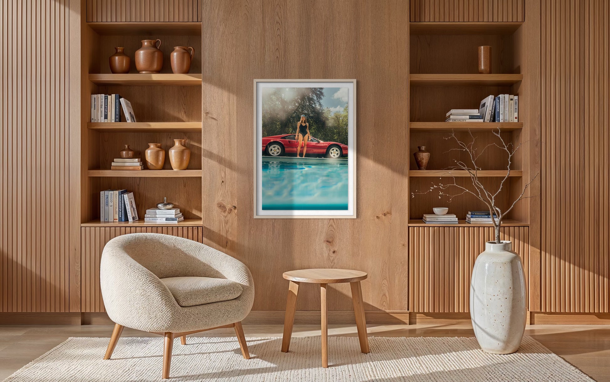 A sun-soaked summer moment captures the Ferrari 328 GTB beside still blue water, where reflections soften form and color. Photographed by the Rooy Twins, the image leans into a relaxed Mediterranean atmosphere - unhurried, elegant, and quietly confident.