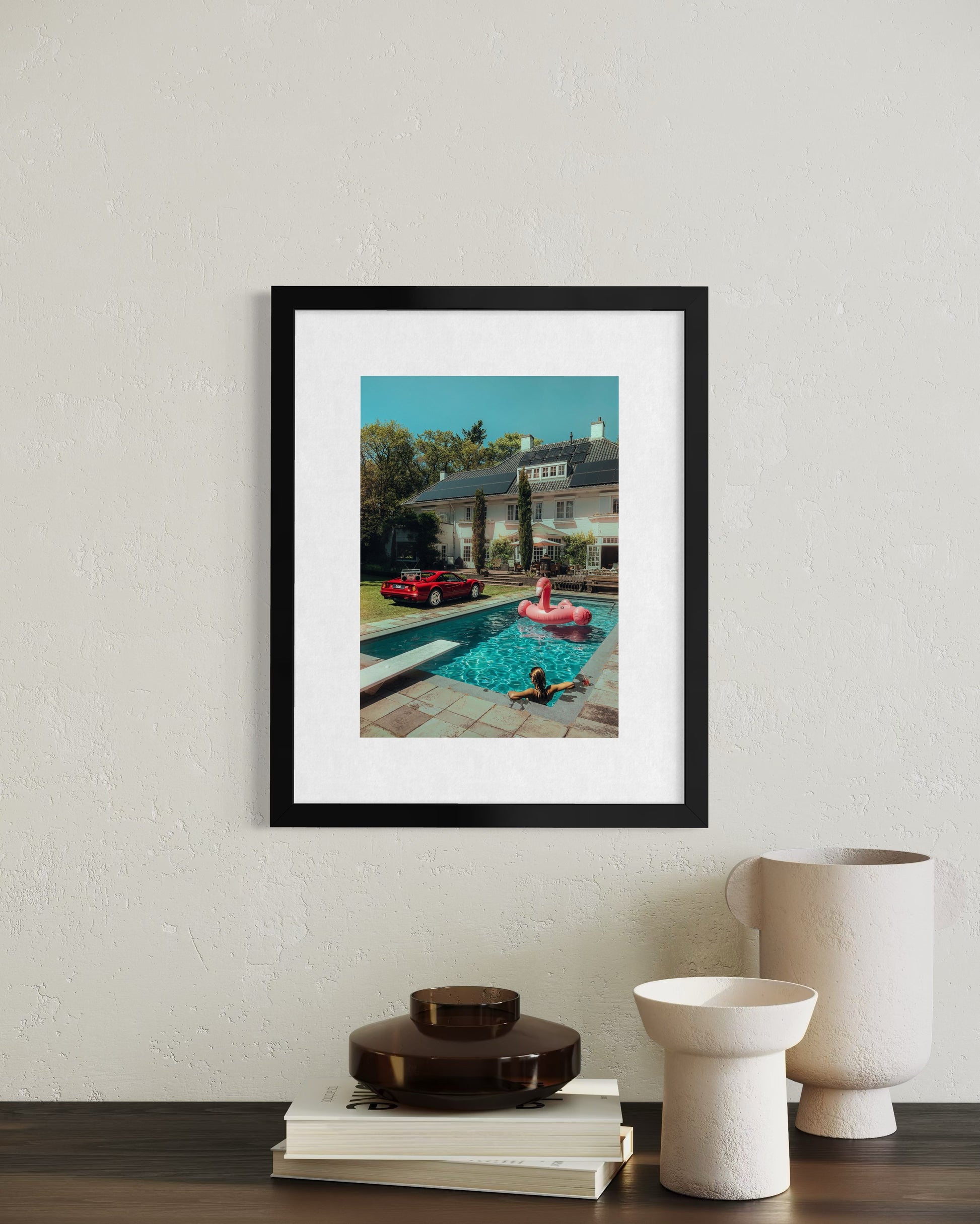 A sun-drenched summer moment frames the Ferrari 328 GTB beside a quiet pool, where vibrant Rosso Corsa meets calm Mediterranean blue. Captured by the Rooy Twins, the image reflects a sense of leisure, balance, and understated luxury - automotive culture seen through a lifestyle lens.