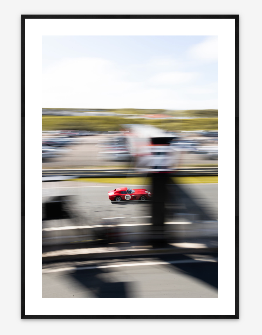 "The Daytona," this dynamic image captures a Ferrari 365 GTB/4 "Daytona" in action at the 2024 Zandvoort Historic Grand Prix. The Ferrari Daytona, renowned for its sleek design and powerful performance, was a formidable competitor in endurance racing, including the 24 Hours of Le Mans. The specific model captured here represents the iconic Ferrari that raced in the early 1970s, known for its distinctive long hood and fastback rear. The Ferrari 365 GTB/4, commonly referred to as the Daytona, achieved significant success at Le Mans, notably participating in the 1971 and 1972 races. This image encapsulates the thrilling speed and elegance of the Daytona as it speeds down the track, echoing its storied racing heritage. The number 111 on the car enhances its historical significance, capturing a piece of motorsport's rich tapestry.